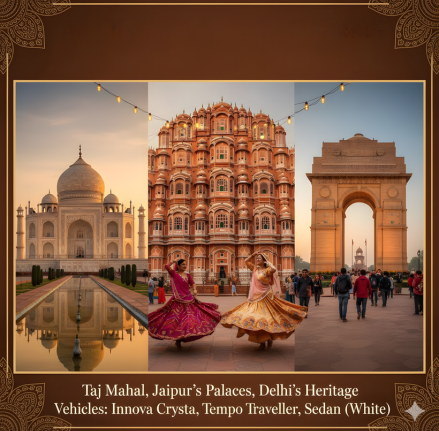 (Delhi–Agra–Jaipur)—The most iconic North Indian route, ideal for first-time travelers. Experience the Taj Mahal, Jaipur’s palaces, and Delhi’s heritage in one unforgettable journey.
